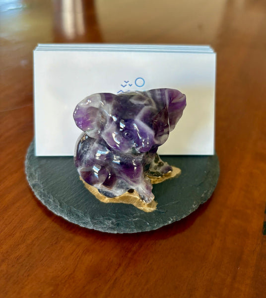 Handcrafted Business Card Holders for your desk created with a carved crystal Koala in amethyst or rose quartz on a stone base with quartz points to hold your cards.