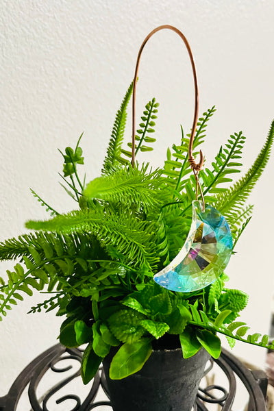 These are hand formed copper plant/garden stakes handcrafted with copper wire adorned with a hanging cut glass moon crystal approx 2" x 1".