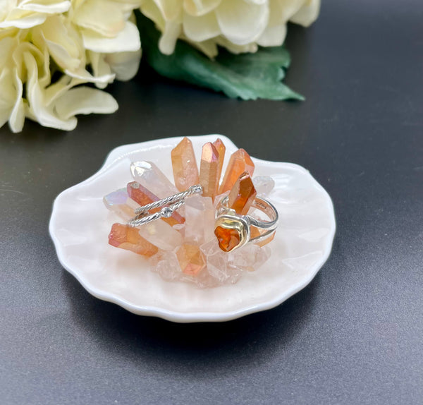 These are handcrafted Amber Aura Quartz crystal ring holders with quartz crystal points, Surrounded with polished clear quartz crystals on a white ceramic seashell dish. The stones are hand picked by me to make them as special as you are.