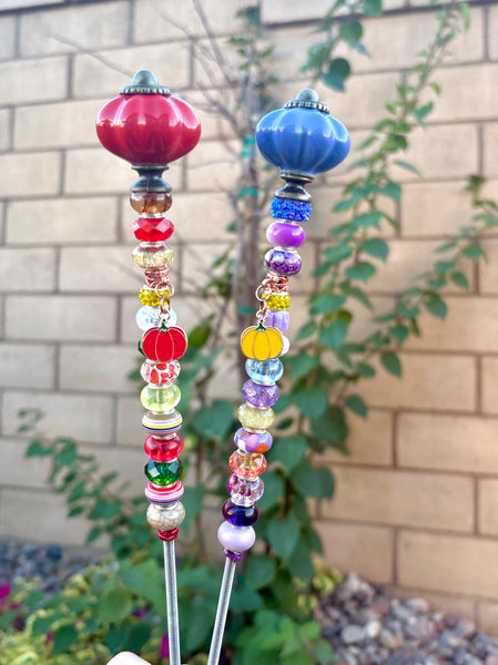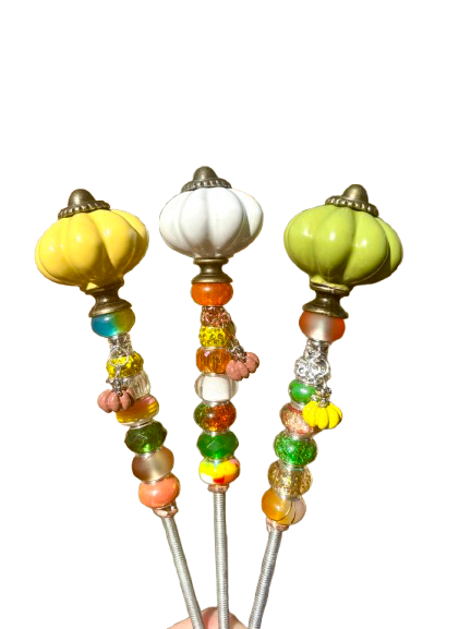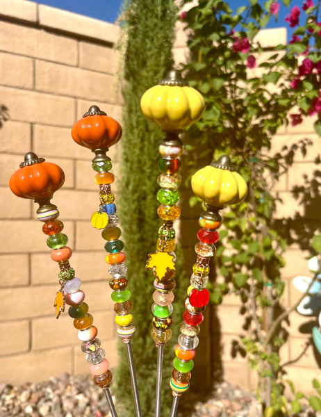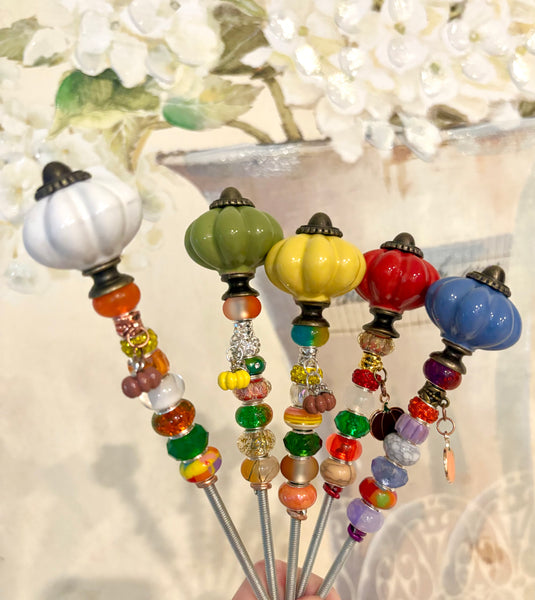 We are into the pumpkin season and we have fun ceramic pumpkin garden stakes. Pop them in your houseplants or dress up your front porch with mums and pumpkin stakes. They add a fall flair to your table centerpiece and are perfect to add fun to your Fall decor from Halloween to Thanksgiving!